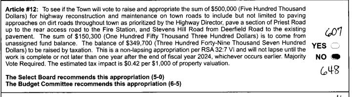This warrant article has much in common with a 2024 warrant article that the voters rejected 648 to 607. Both warrant articles include paving part of Priest Road and paving at intersections where dirt roads meet paved roads. The difference this time is that Ledge Farm Road has been substituted for Stevens Hill Road, which got paved last year.
